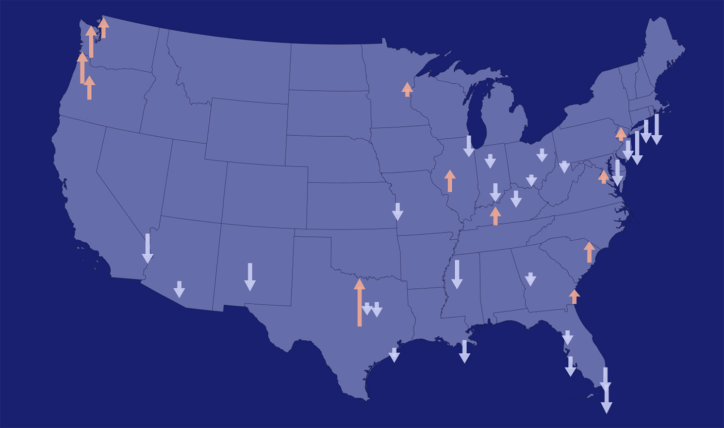 The above graphic shows eviction filings for sites we track, relative to their historical baseline. Arrows pointing up show sites with above baseline filings; arrows pointing down show the reverse.